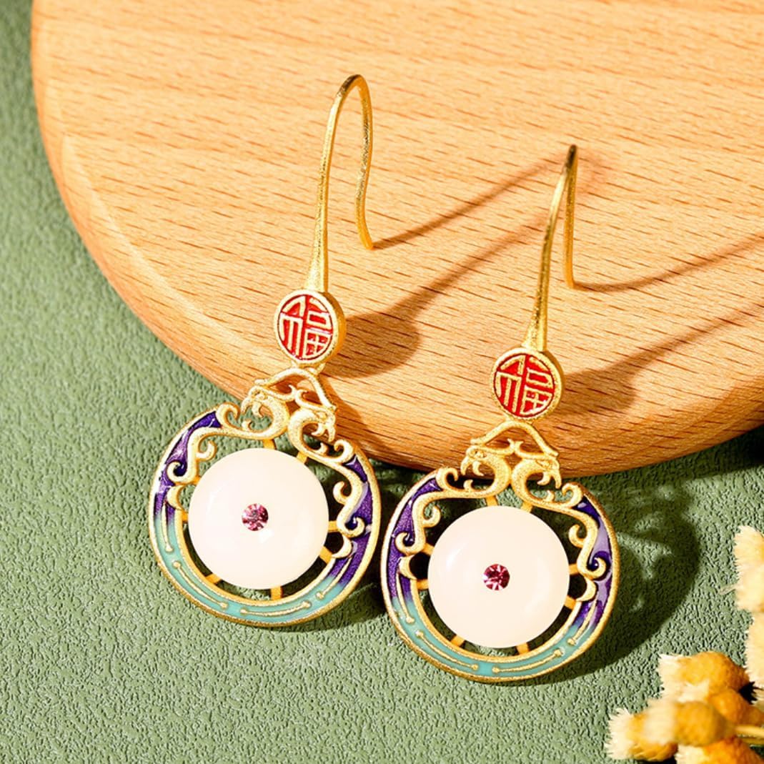 Vintage Chinese Style Earrings and Necklace Set - Brass with Enamel Peace Buckle Inlay
