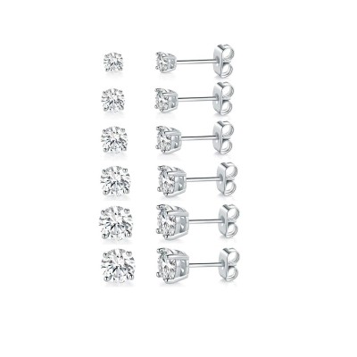18K White Gold Plated 4 Pong Round Clear Cubic Zirconia Stud Earring Pack of 6 Pairs (6 Pairs)
