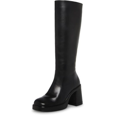 Black Leather Boots Platform Boots for Women Square Toe Chunky Block Heeled Boots