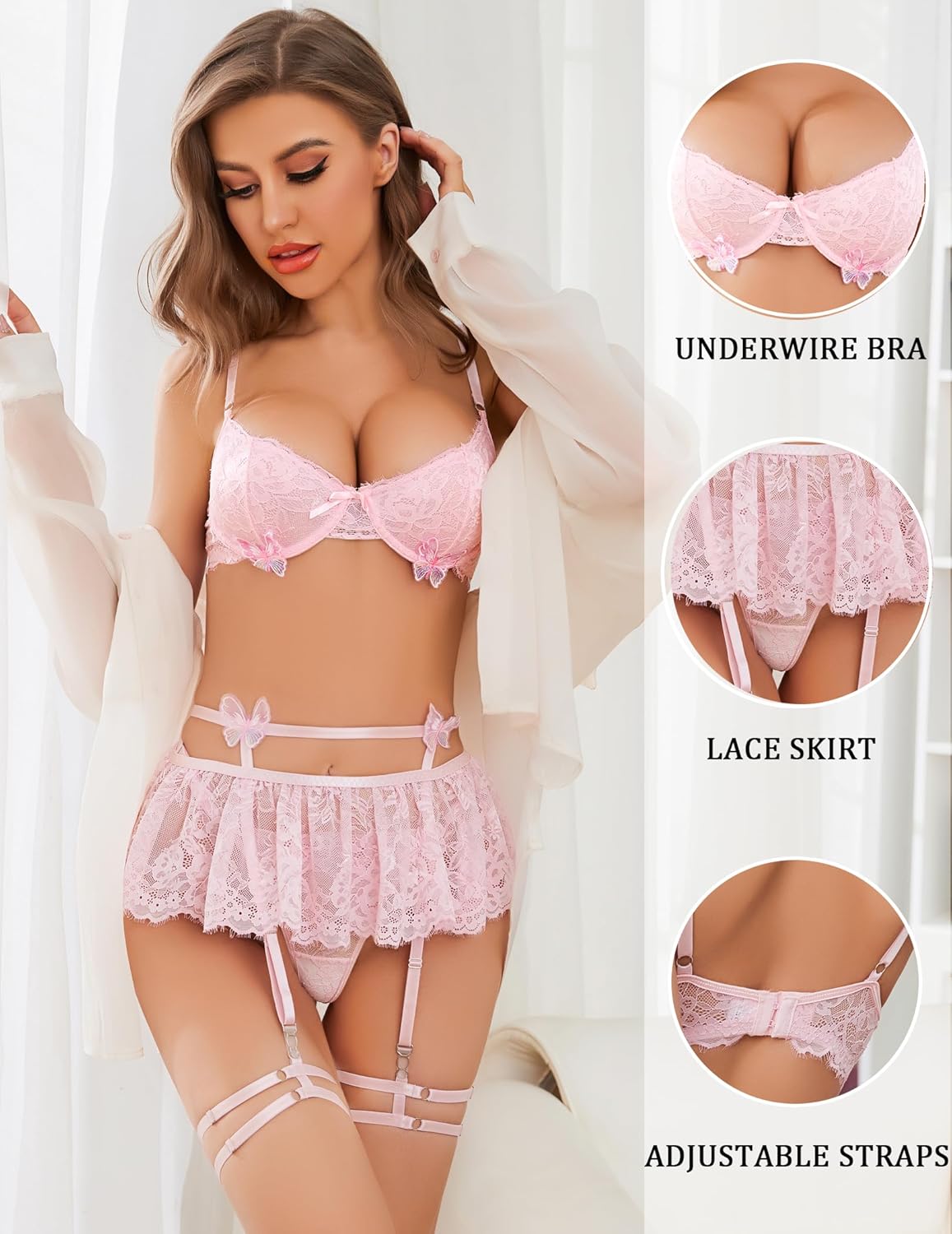 女式性感内衣,3 件套蕾丝内衣套装文胸和内裤套装带吊袜带娃娃装泰迪内衣