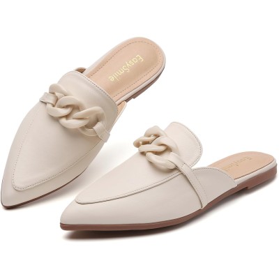 Metal Chain Decor Flat Mules for Women Closed Pointed Toe Slip on Loafers Slides Backless Mules Shoes